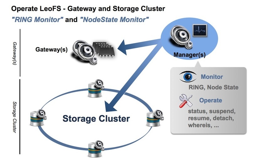 LeoManager monitors the state of LeoGateway and LeoStorage nodes to keep the high availability of a LeoFS system. A consistency of RING (distributed hash table) of LeoGateway and LeoStorage nodes are always monitored by LeoManager to prevent split-brain.